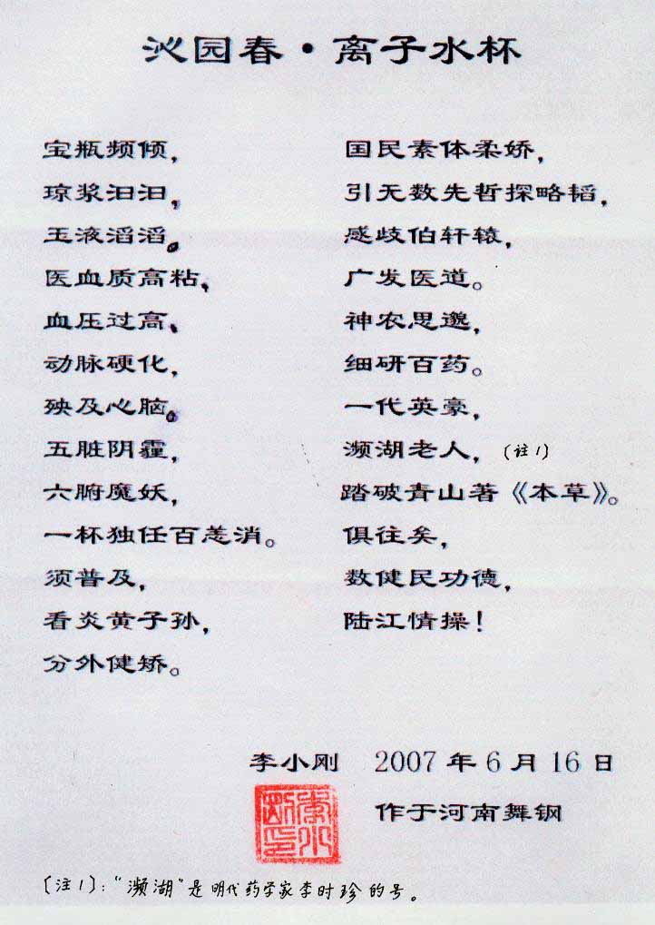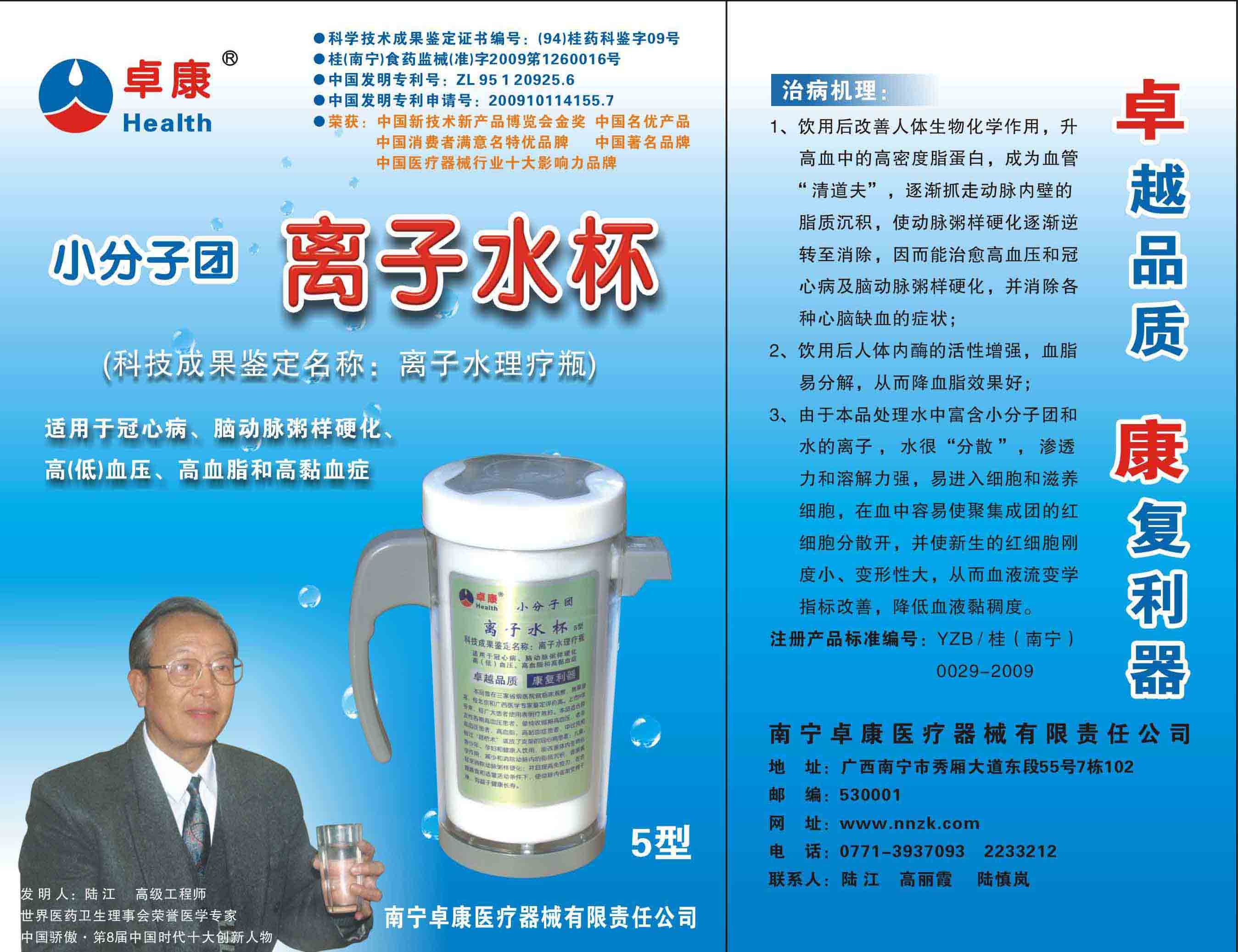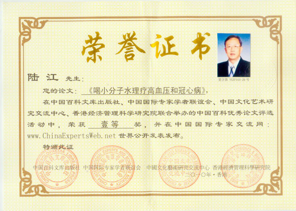 -----我是從事建筑的高工,本來沒有資格去攻克醫學難題,卻為了自身健康才扣響醫學的大門。由于我1990年患高血壓,因怕中風才研究發(fā)明了離子水瓶,我把水處理成微小分子團水,飲用后治愈了高血壓。便于1993年底送到三家省級醫院做臨床試用4個月。經北京和廣西醫學專家鑒定:"降脂降壓效果好"," 能擴大心腦動脈流量,改善心腦電圖以及微循環(huán)","對治療心腦動脈粥樣硬化、高血壓、高血脂有良好的醫療保健作用。""產品的技術性能和療效達到了同類產品的國內領先水平,經廣西醫學科學情報研究所檢索,未見國外有類似報道。"中國醫學科學院張正國教授從美國國立醫學圖書館數據庫存Medline檢索英俄文資料,均未見類似報告。2000年上市后,我為了對消費者負責而繼續觀察研究,一直通過《信譽卡》和《質量跟蹤調查書》向患者承諾療效,請用戶使用6個月后反饋效果。和脂壓患者飲用2至5個月內,消除癥狀,停服藥物,血壓正常;冠心病患者飲用3~5個月逐漸減輕至消除心絞痛、房顫等癥狀,不再服藥,飲用1年左右心電圖正常,經冠脈造影掃描無明顯狹窄,表明冠心病痊愈。大量患者還反映許多衰弱器官被修復,讓前列腺增生、慢性咽喉炎、慢性氣管炎、支氣管炎、慢性胃炎、腸炎和膽囊炎等不藥而愈;2型糖尿病患者是因為胰島衰弱致病,飲用該水半年至一年,逐漸減藥至停藥,血糖尿糖正常,真正治愈2型糖尿病。中風后遺癥患者飲用六七個月,可逐漸減輕至消除肢體和語言障礙,表明飲用該水能讓壽命很長的神經元細胞逐漸修復,奇跡般地恢復肢體和語言功能。飲用后還使胸腺和脾臟兩個重要的免疫器官被修復和增強,產生免疫細胞多,提高了免疫力,使人不生病或少生病。自此, 飲用微小分子團水創造了攻克冠心病、高(低)血壓和糖尿病三大醫學難題的奇跡。人們對此感到不可思議,但實踐是檢驗真理的唯一標準。