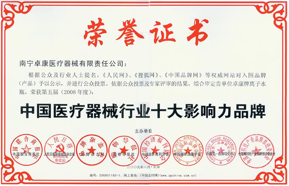 卓康牌離子水瓶榮獲中國名特優(yōu)品牌[點小圖見大圖] *榮獲中國醫療器械行業十大影響力品牌[點小圖見大圖]--------
